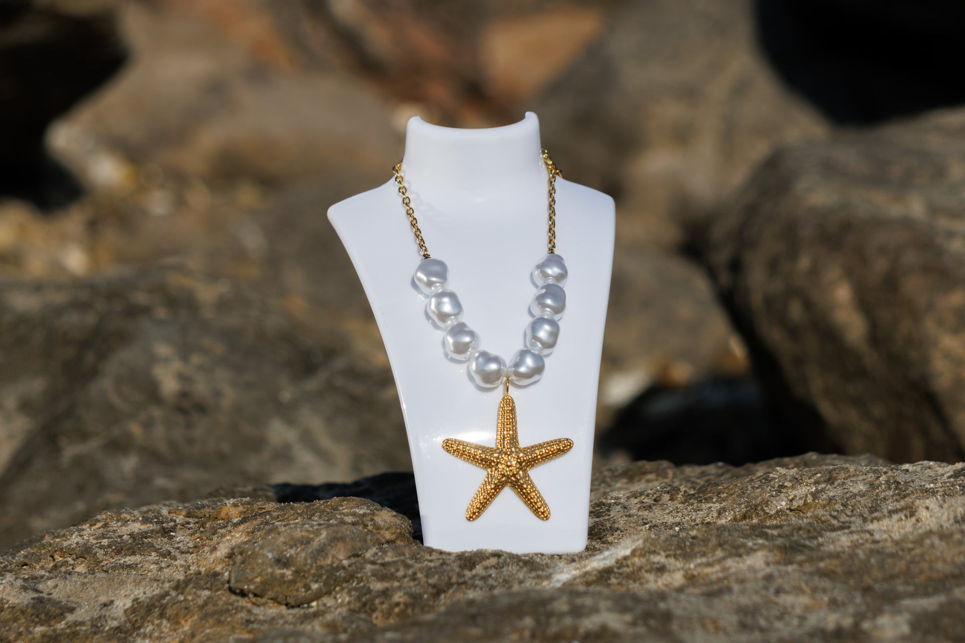 Découvrez le collier Estrela, sublimé par de délicates pierres nacrées blanches et une étoile de mer, pour une touche classe et raffinée aux accents marins.