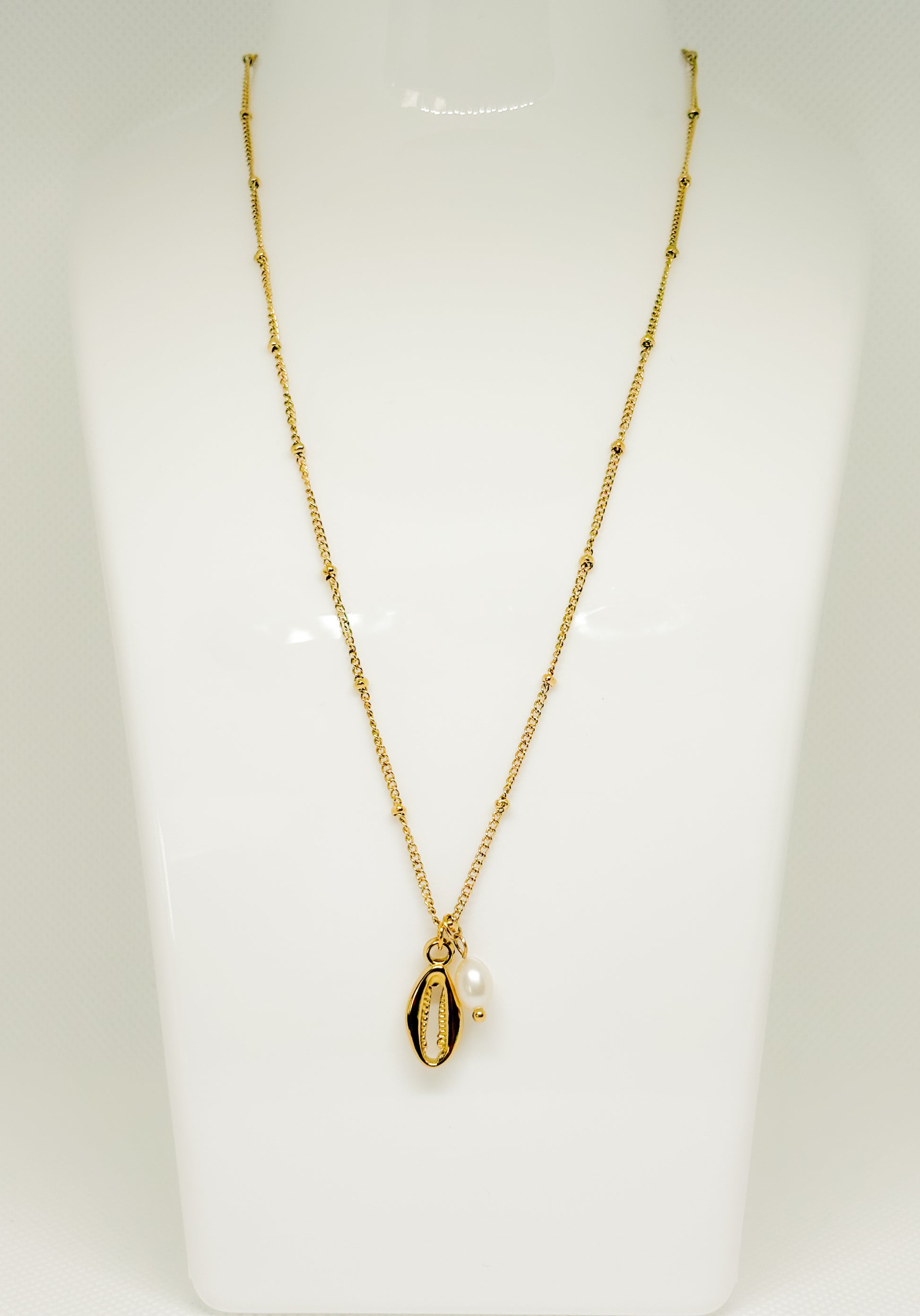 Collier “Seyona” – un délicat assemblage de coquillage et de perle blanche, évoquant l’élégance et la douceur des plages paradisiaques.